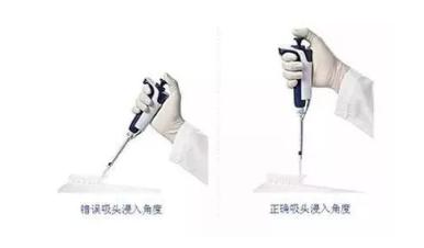 錯(cuò)誤:吸液時(shí),移液器傾斜吸液;
