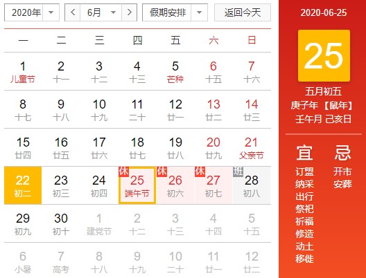 6月25日至27日放假調(diào)休,共3天。6月28日(星期日)上班。