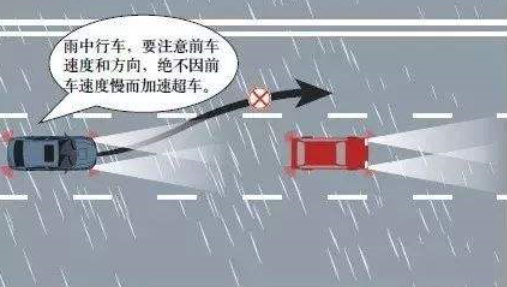 雨天視線受阻,一定要隨時注意前車的行駛速度和方向,絕不可因前車速度慢而加速超車。雨天輪胎與地面的摩擦力大大減小,如果加速超車的話,很容易造成輪胎側(cè)滑,造成交通事故。