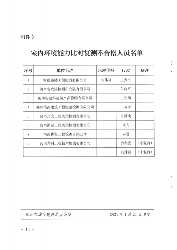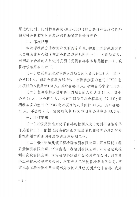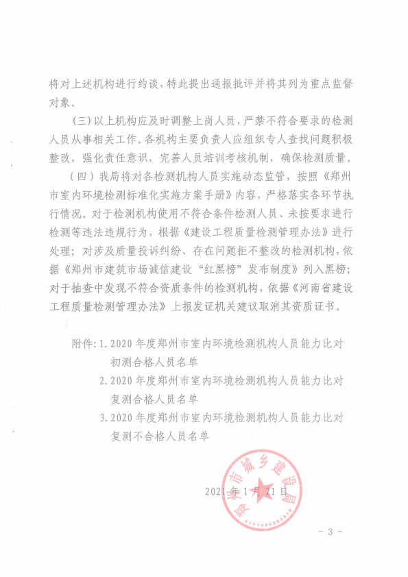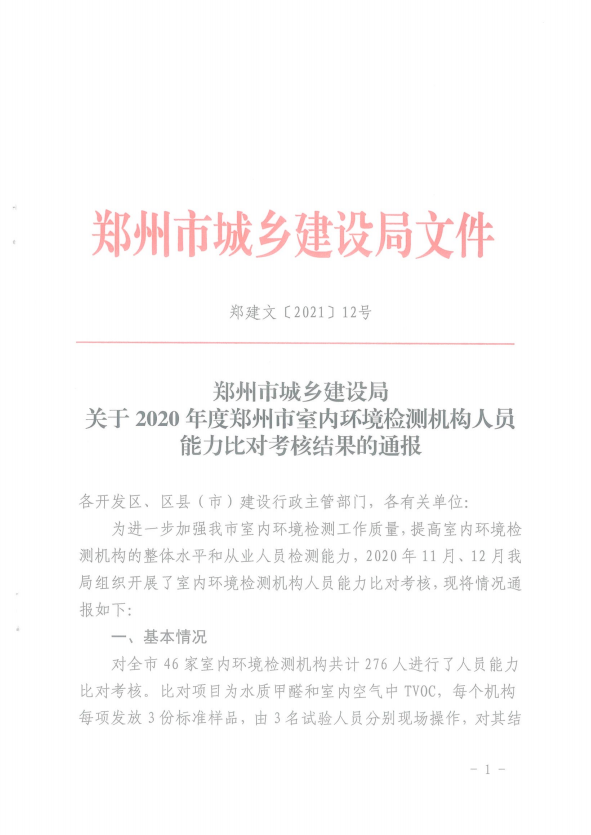 鄭州市城鄉(xiāng)建設(shè)局關(guān)于2020年度鄭州市室內(nèi)環(huán)境檢測(cè)機(jī)構(gòu)人員能力驗(yàn)證結(jié)果的通報(bào)