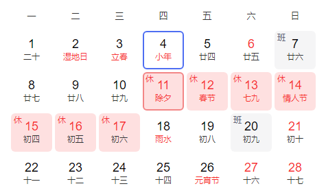 2月11日至17日放假調休,共7天。2月7日(星期日)、2月20日(星期六)上班。