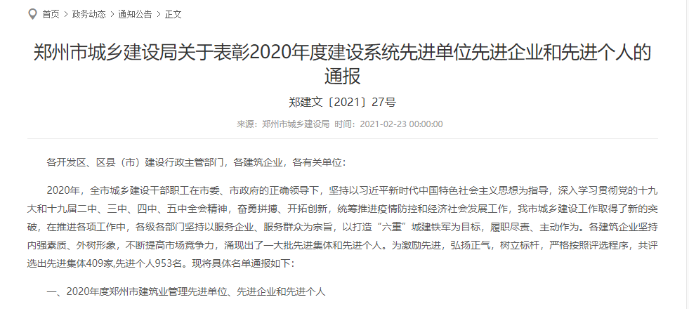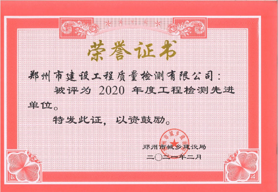 2021年2月23日,根據(jù)鄭州市城鄉(xiāng)建設(shè)局公布的“關(guān)于表彰2020年度建設(shè)系統(tǒng)先進(jìn)單位先進(jìn)企業(yè)及先進(jìn)個(gè)人的通報(bào)(鄭建文〔2021〕27號(hào)),我公司被評(píng)為“2020年度工程檢測(cè)先進(jìn)單位”,這無疑為我們今年的高速發(fā)展打了一劑強(qiáng)心針。